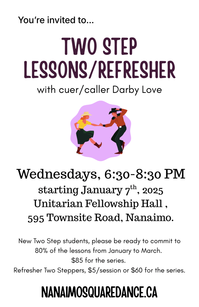 Wednesday evening TWO STEP lessons with Mainstream dancing in Nanaimo, 6:30-8:30PM, from January 7 – March 25, 2026